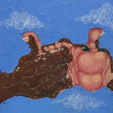 "My recent work moves through the quiet terrain of subconscious thought; those impressions that linger, persistent and unspoken. Growing Pains becomes a map of these inner landscapes, where surrealism and texture trace recurring themes of religion, discipline, fear, and desire. Figures emerge fragmented, present yet dissolving, suspended in a liminal state: both self and symbol, grounded and vanishing. Against raw, natural environments, they mirror the architecture of my inner world, a world negotiating belief, autonomy, and the weight of taking up space. Rooted in the tactile act of making and unmaking, this body of work is both physical and poetic. My fears of smallness, of silence, stand beside my deepest desires, creating a space where contradiction breathes. As a queer Black artist, my body becomes a site of expansion, political not by intention but by existence. Through texture, gesture, and surreal figuration, I imagine Blackness beyond the oppressive gaze, unshackled, capacious, whole. These works speak in a language that is at once ancient and contemporary, echoing vernacular histories while conjuring worlds where Black beings are encountered in their fullness, their joy, their aliveness.